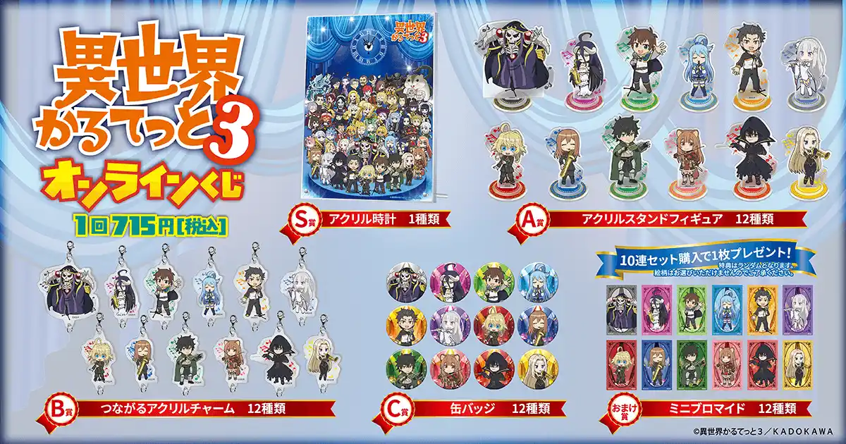 株式会社KADOKAWA(本社:東京都千代田区、取締役 代表執行役社長 CEO:夏野 剛、以下 KADOKAWA)は、運営するオンラインくじサービス「くじ引き堂」において、TVアニメ「異世界かるてっと3」の豪華賞品が手に入る<TVアニメ「異世界かるてっと3」オンラインくじ>を、2025年12月9日(火)12時より販売します。 |