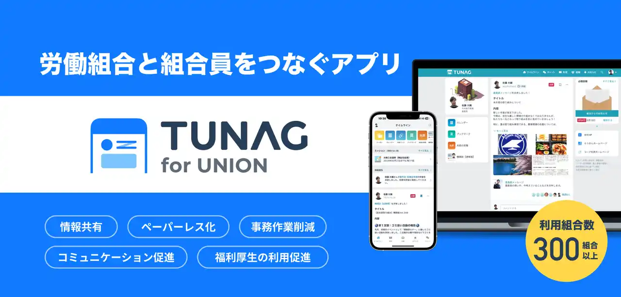TUNAG for UNIONは、組合活動に必要な情報を集約できるアプリです。2022年1月サービスリリースし、業種業態・規模問わず様々な組合に導入いただき、現在300以上の組合にご活用いただいております。労働組合に関する全ての情報について、「発信するだけでなく、一人ひとりに受け取ってもらう」ことまでを重視しています。 |
