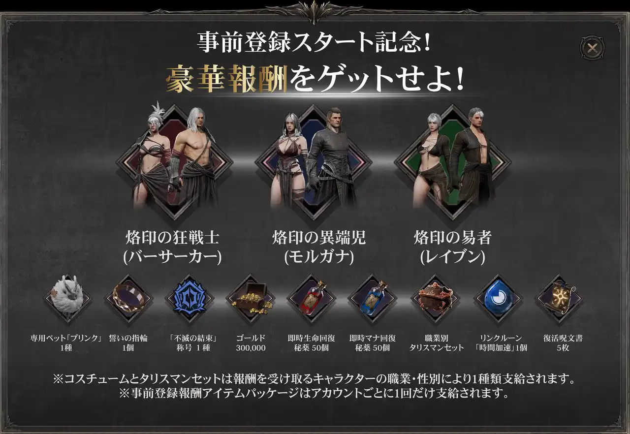 ※コスチュームおよびタリスマンセットは、受け取るキャラクターの 職業・性別 により内容が異なります。 |