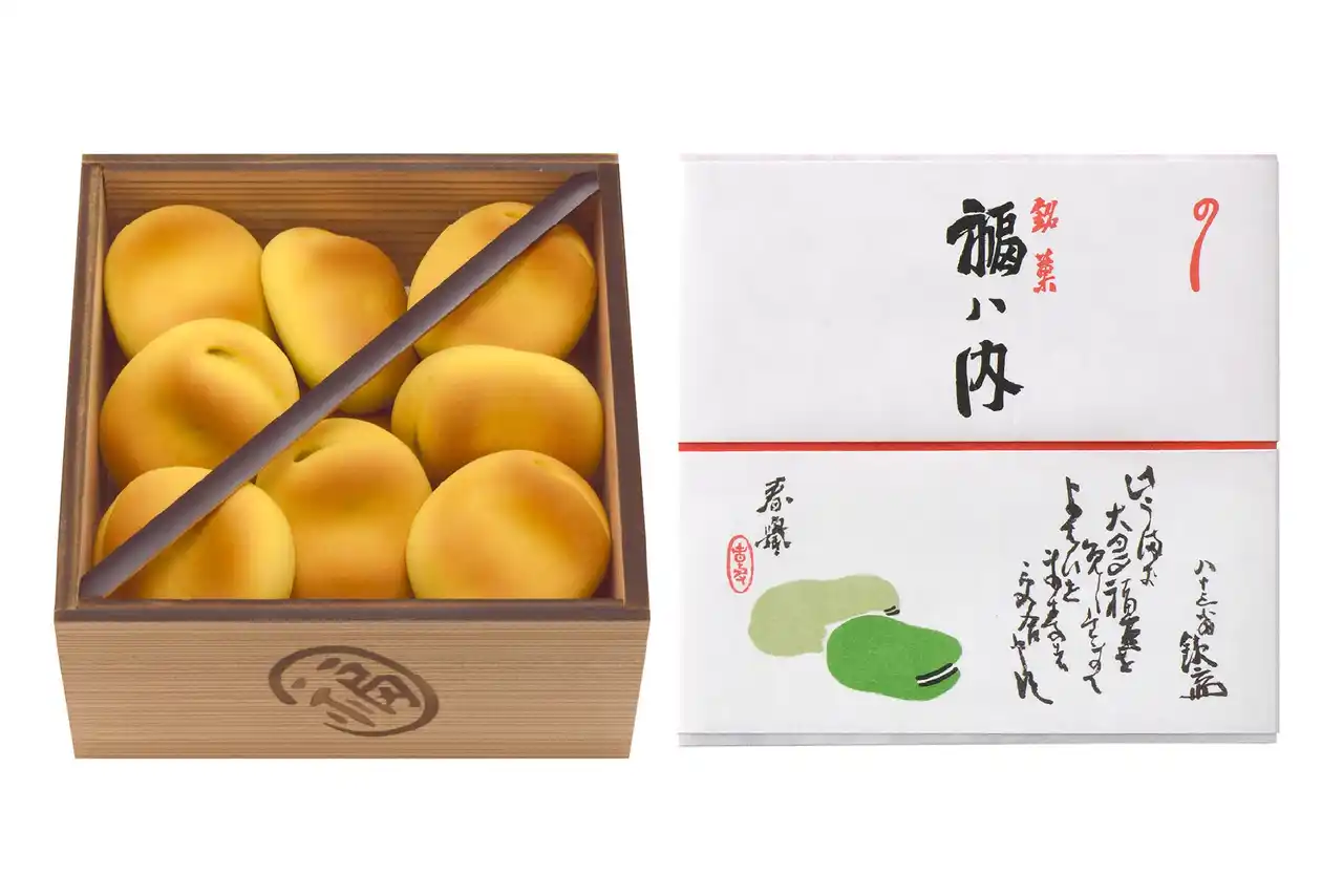 福を招く「お多福豆」になぞらえた、ふっくら桃山製の焼き菓子。明治37年の創案以来、鶴屋吉信の冬を代表する銘菓として120年以上もの間ご愛顧いただいております。元々は節分の豆まきから発想を得た「福ハ内」。特製の木箱は「桝(ます)」の形を模し、「ますます」繁盛しますようにとの願いをこめました。 |