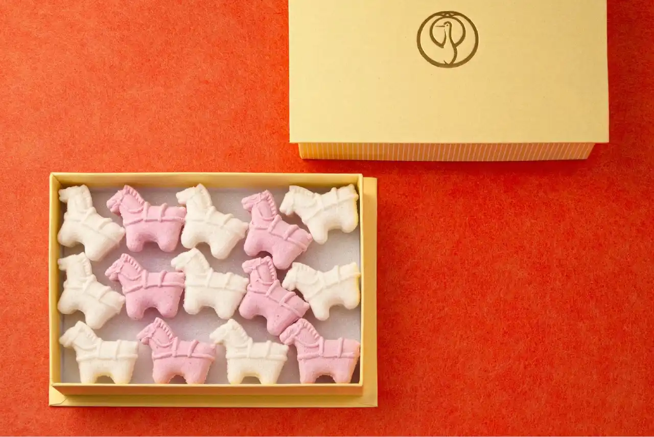 新年を祝う伝統のお干菓子詰合せです。馬具をつけた凛々しい馬の立ち姿を、白の落雁・ピンクの和三盆入り落雁であらわしました。お口の中ですうっと溶ける繊細な味わい、上質でやわらかな甘味。定番のお抹茶、あたたかい日本茶のほか、コーヒーなどにもよく合います。 新年のお茶席をはじめ、日々のお茶のおともにもどうぞ。 |