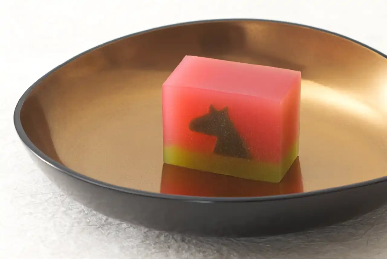 希望の春に向かい千里を駆ける駿馬の姿を、吉例の意匠羊羹であらわしました。古来中国や朝鮮では能力のある人物を伝説上の「千里を駆ける馬」に例えたといいます。