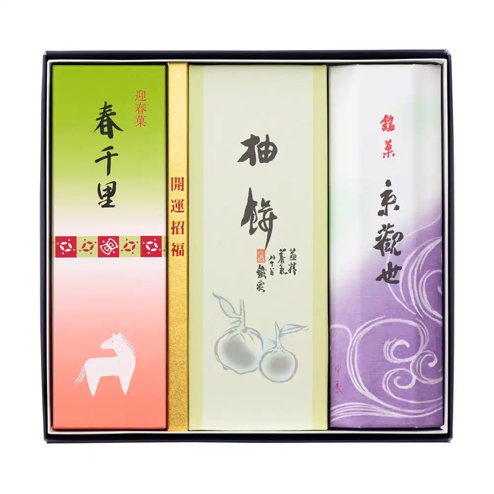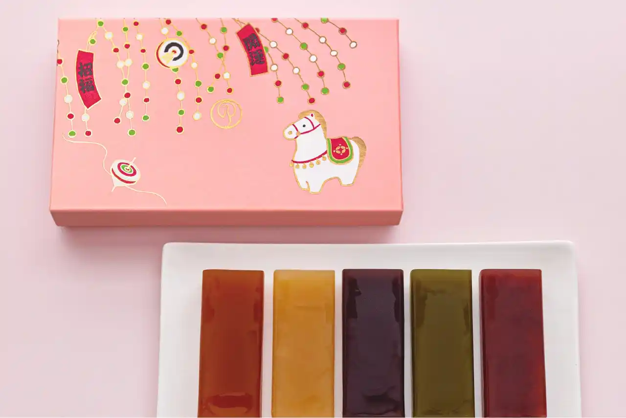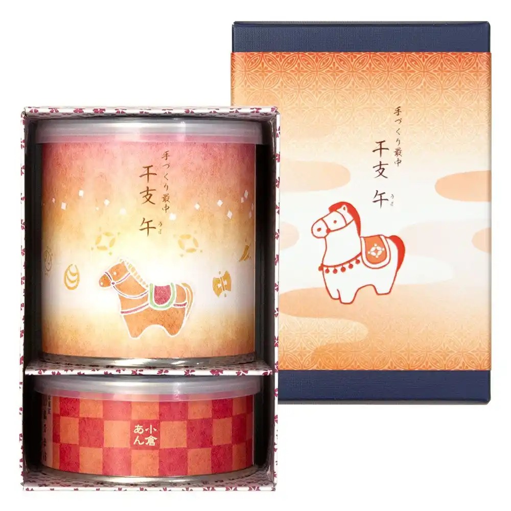素材から厳選した人気のミニ羊羹5種(小倉・抹茶・黒糖・白小豆・キャラメル)を、「午」デザインをあしらった新春限定のBOXに詰め合わせました。 |