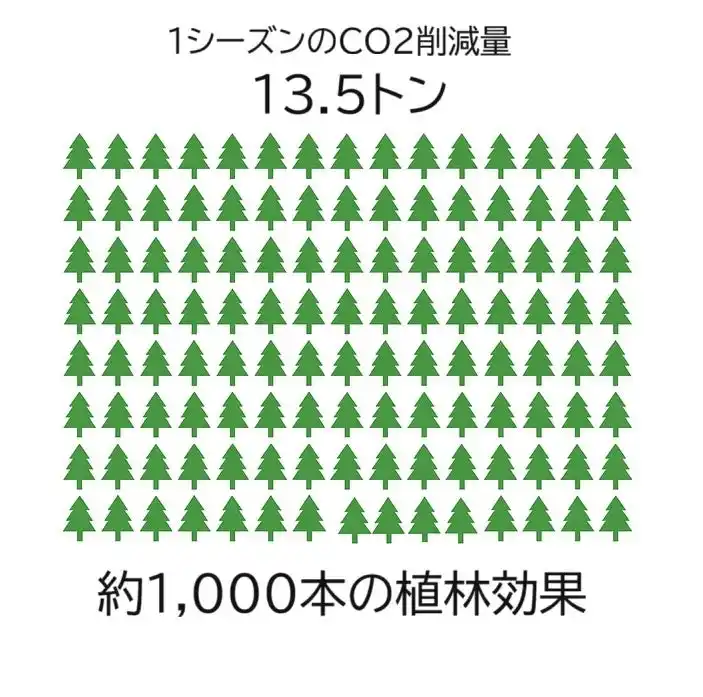 1シーズンのCO2削減量13.5トンとなり、これは、成木およそ1,000本が1年間かけて吸収する |