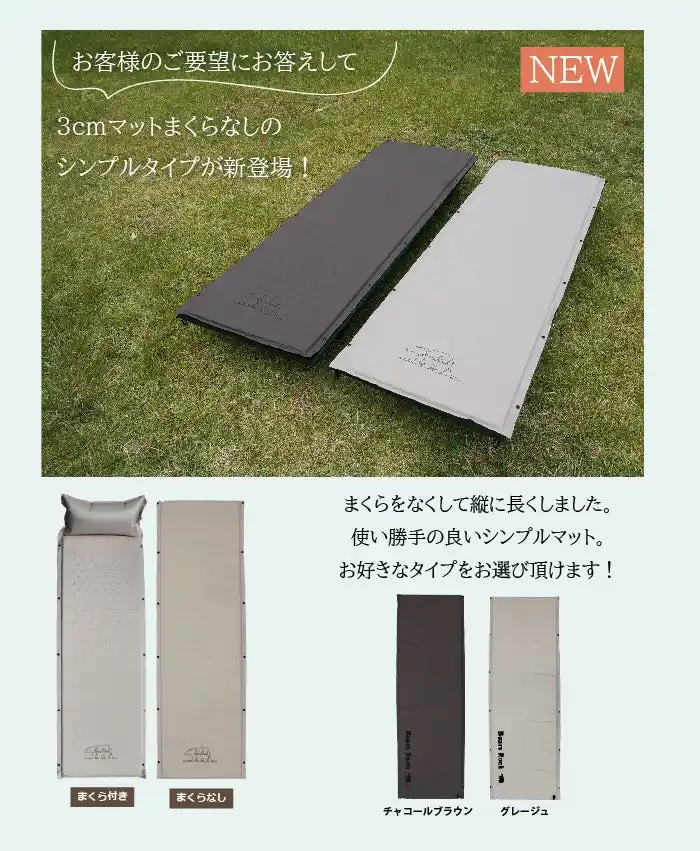 キャンプ用や防災用で人気の「3cmキャンプマット」シリーズに、新しく“まくらなしタイプ”が加わりました。 これまで展開してきたまくら付きモデルは、その手軽さと使い心地の良さで多くのユーザーに選ばれてきましたが、一方で「自分の枕を使いたい」「その分マットを長く使いたい」という声も寄せられていました。 今回、その“もう一つのニーズ”に応える形で、用途に合わせて選べる新ラインアップとして、まくらなしモデルが誕生。 収納時のコンパクトさも魅力で、防災用として備えておきやすいアイテムとしても注目していただけます。 |