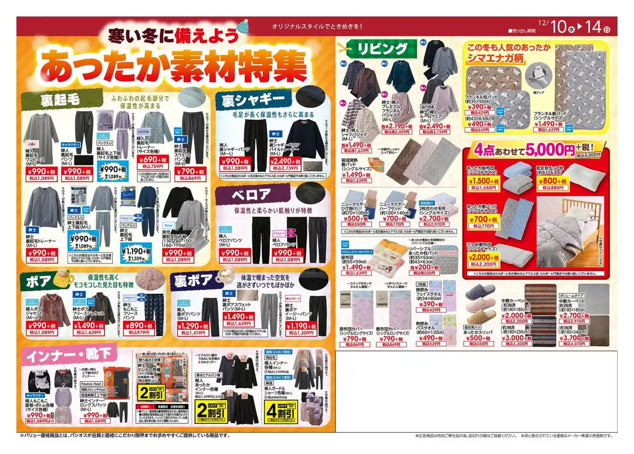 | 寒い冬に備えて、あったかアイテムがお買得なパシオスへぜひお越しください。 | ||||