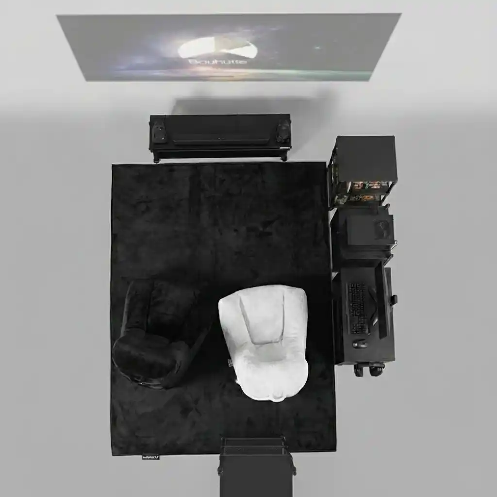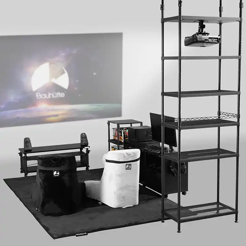 部屋を100インチ超えの大画面シアターに魔改造するレイアウトを新たに考案。プロジェクターを天吊りラックで空間を邪魔せずスマートに設置し、テレビ台やスピーカースタンドの高さも自由に調節することで、大迫力の映像とサウンドを最適なポジションで楽しめるのが特長です。ソファや着る毛布にくるまりながら、ふかふかのラグの上でぬくぬくとゲームに没頭可能。ゲーム機やデバイスの収納にも配慮し、ごちゃつきがちな配線や機材を隠しつつ、必要な時にすぐにアクセスできる機能性を両立させた、究極の「おこもりシアター」環境です。 |