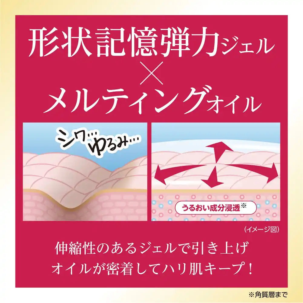 伸縮性のある形状記憶弾力ジェルで引き上げ、メルティングオイル*⁴が肌にピタッと密着する「Wリフト」がポイントです。 |