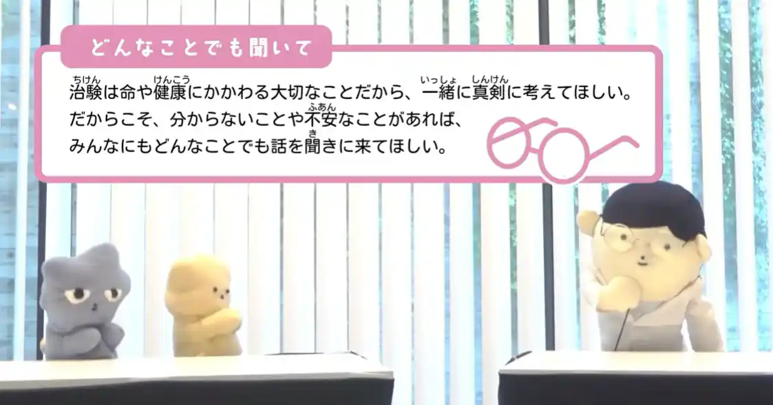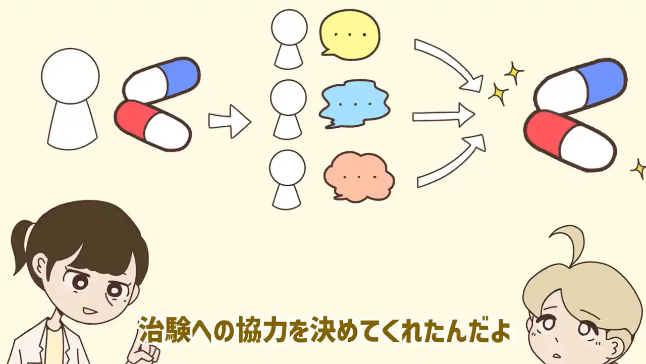 治験に関する説明時に用いられる「同意説明文書」は、専門用語や長文が多く、一般の方には理解が難しいという課題があります。本プロジェクトでは、説明文書の中でも特に理解が難しい項目や患者が不安を抱きやすい部分を選定し、アニメーションやマンガのストーリーを通して丁寧に伝えることで、治験に対する正しい理解の促進を目指しました。 |