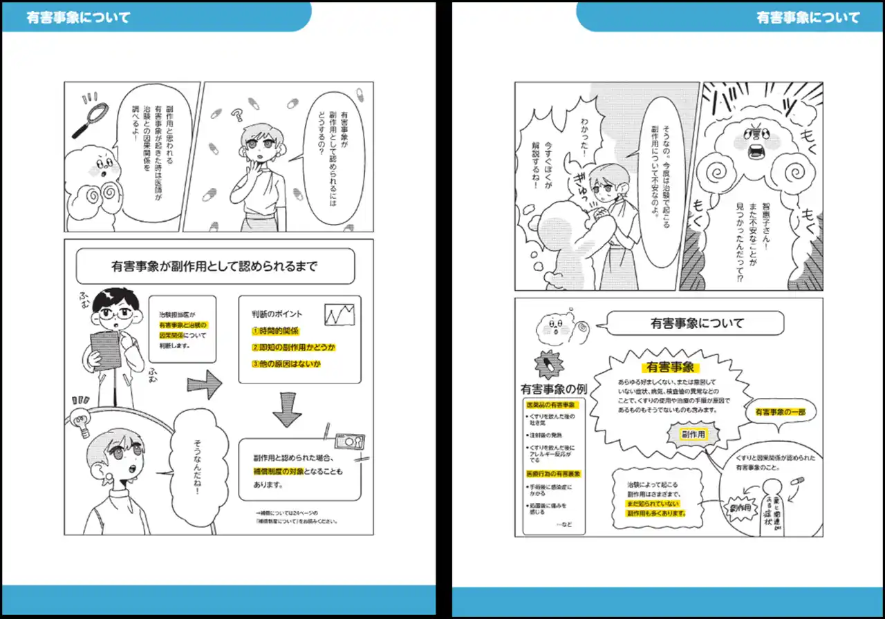 治験の基本情報に加え、「治験費用」「有害事象」「補償制度」などをテーマに取り上げ、マンガで伝わりやすい表現を目指しました。 |