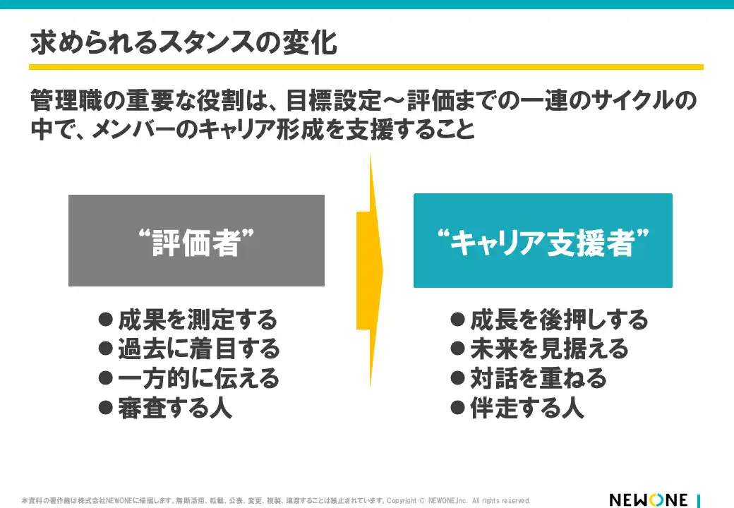 | エンゲージメント向上を軸に“推せる職場づくり”を支援する株式会社NEWONE(本社:東京都港区、代表取締役:上林 周平、https://new-one.co.jp/ 以下、NEWONE)は、管理職が担う評価面談を「結果を伝える場」から「メンバーの成長とキャリア自律を支援する場」へと転換する新プログラム「目標設定・評価者研修」をリリースしました。 | ||||||||||||