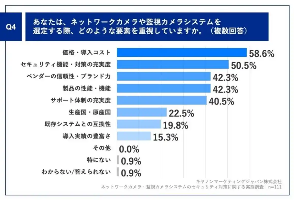 「Q4.あなたは、ネットワークカメラや監視カメラシステムを選定する際、どのような要素を重視していますか。(複数回答)」(n=111)と質問したところ、「価格・導入コスト」が58.6%、「セキュリティ機能・対策の充実度」が50.5%、「ベンダーの信頼性・ブランド力」が42.3%、「製品の性能・機能」が42.3%という回答となりました。 |