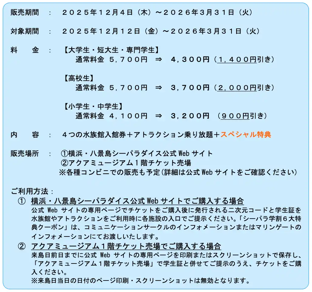 受付方法 : 『横浜・八景島シーパラダイス』公式Webサイトにて事前販売 |