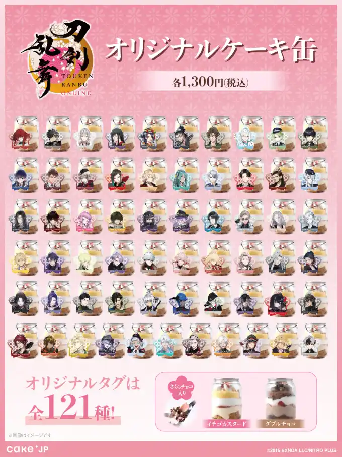 「刀剣乱舞ONLINE」とコラボレーションオリジナルケーキ缶を発売いたします。刀剣男士121振りの中から、お好きな刀剣男士のタグ付きケーキ缶をお選びいただけます。刀剣乱舞をイメージした、さくらチョコとアラザンでかざりつけています。 |