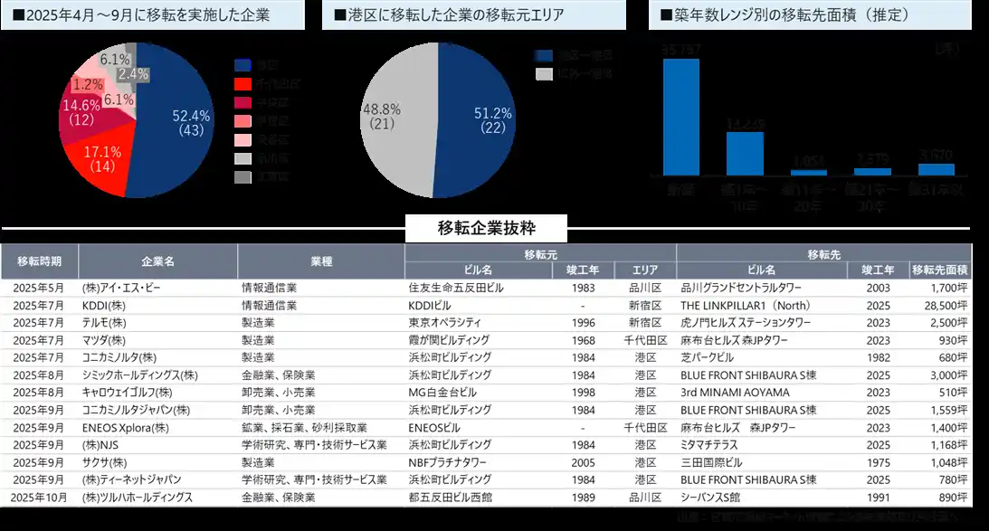 「港区から港区への移転」「既存ビル(1980年台~1990年台竣工)から築浅ビルへの移転」という2つの傾向がうかがえる。 |