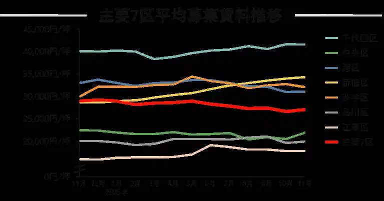 主要7区の平均募集賃料は27,077円/坪で前月比+435円/坪。 |