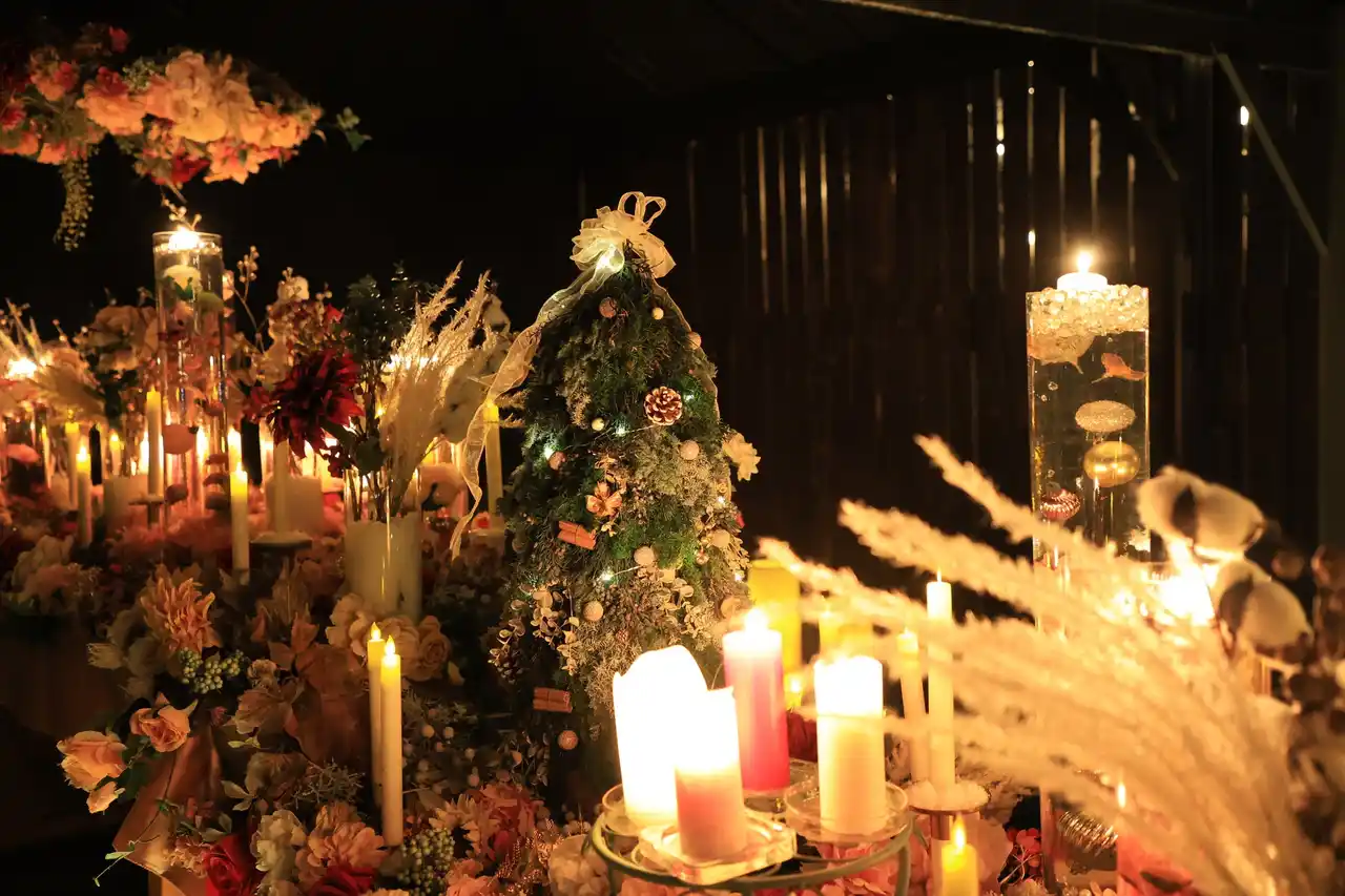 テーブルコーディネートをテーマに花と生火のキャンドルを組み合わせた華やかな展示スポット「花々の祝福」では、11月とは違ったクリスマス装飾に模様替えをしています。 |