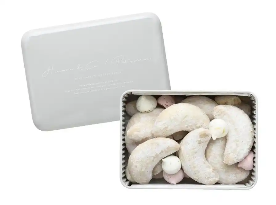 オーストリアの伝統的な焼き菓子、キッフェルン。ぷっくりとした三日月モチーフで、ヘーゼルナッツ、フランス産小麦を使い香ばしくてさっくりホロホロに仕上げました。お口直しに果汁を使った甘酸っぱいメレンゲを添えました。 |