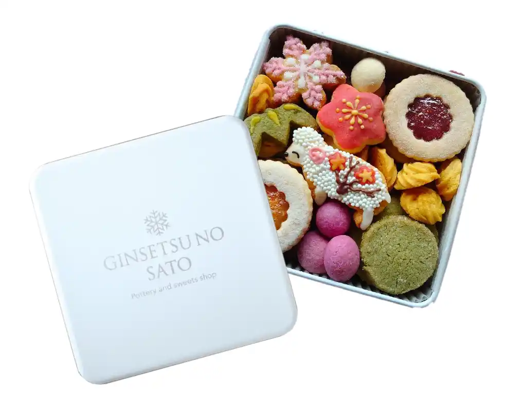 奈良県の陶芸作家が手掛けるクッキー缶。開けるとまるで宝石箱のよう。愛らしいひつじやいちごと柚子のフルーツサンドクッキーなど彩り豊かなクッキーを詰め合わせました。 |