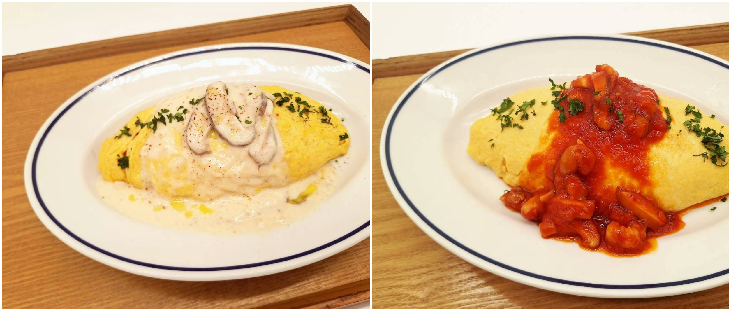 ふわとろの卵で包み、ソースはコク深い「きのこのクリームソース」と、やさしい酸味が広がる「きのこトマトソース」の2種類からお選びいただけます。