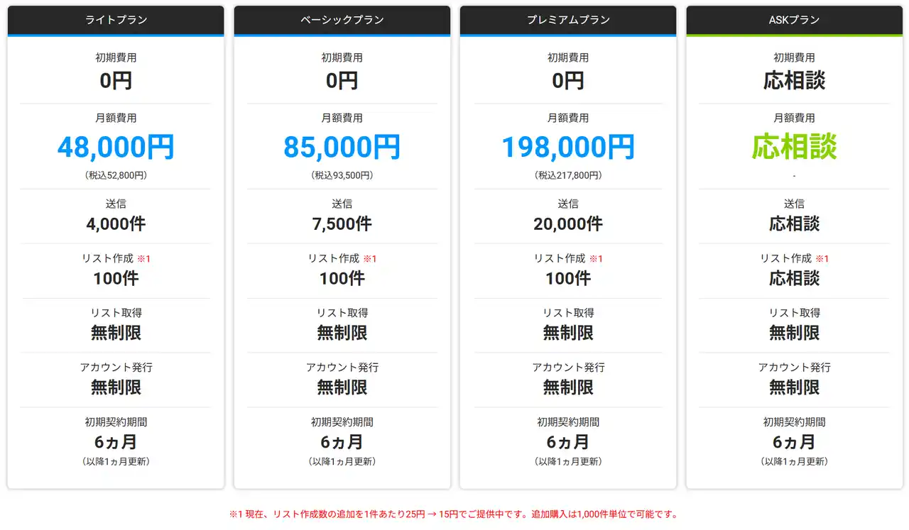4.8万円~で4000件以上の企業にアプローチが可能(1件あたり12円~)、自社での作業やフォームDM代行などに比べ、大きく時間を短縮しながらより多くの企業に低コストで営業が可能なため、より多くの新規案件獲得が見込めるサービスです。 |