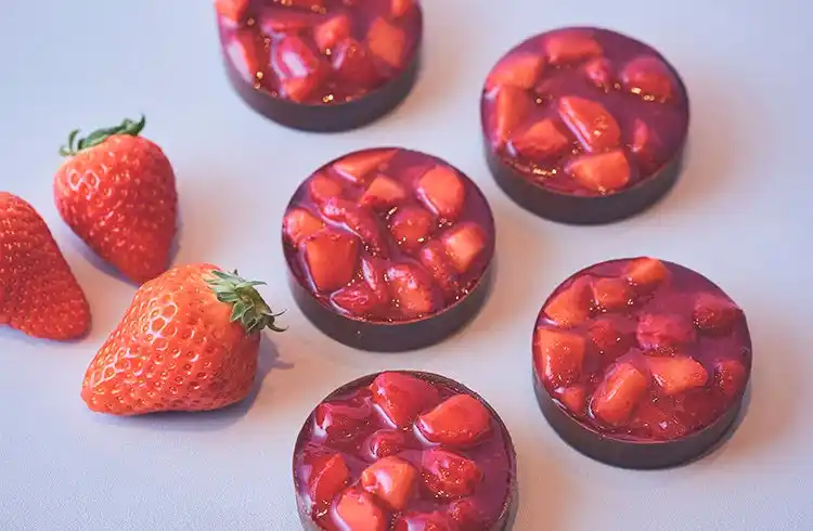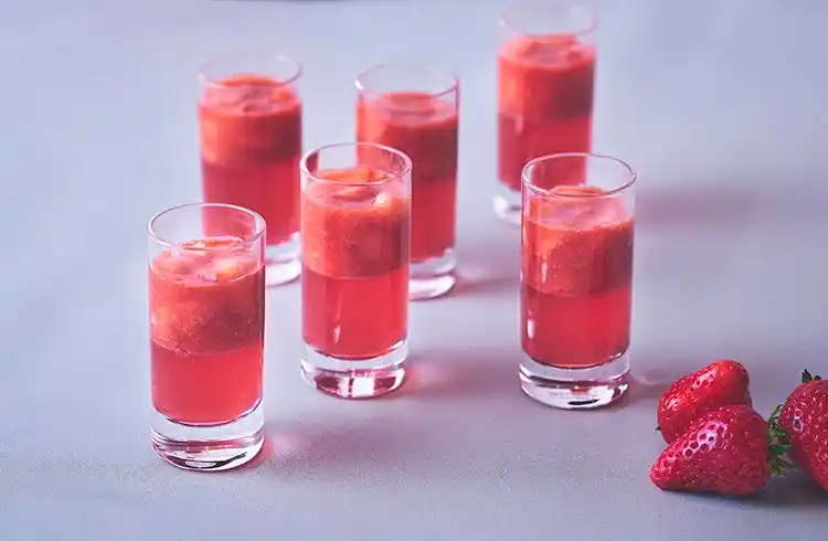 華やかなロゼスパークリングワインの香りと、みずみずしいイチゴを閉じ込めたキューブ型ゼリー。ロゼスパークリングワインの上品な風味とイチゴの甘さが口の中で広がります。 ※洋酒を使用しています。お子様やアルコールが弱い方、妊娠・授乳期の方、運転時などはご遠慮ください。 |
