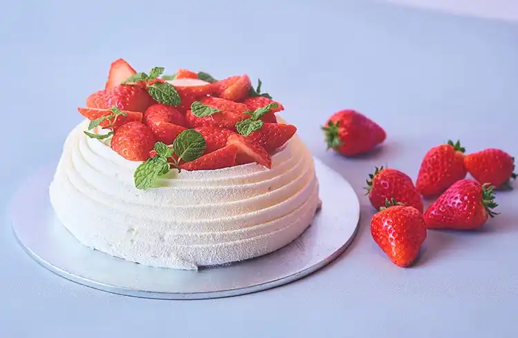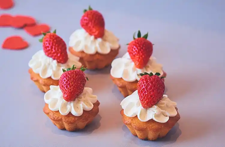 アーモンドフィナンシェの上にストロベリー、ライチ、ローズゼリーをのせ、爽やかなストロベリームースで包みました。贅沢にトッピングした京都産イチゴとともにお楽しみください |