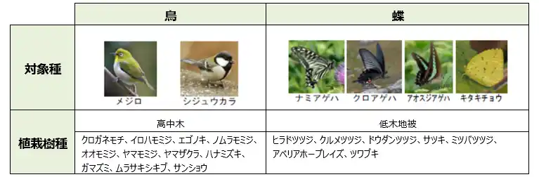 【配慮対象とした鳥や蝶の種と、それらが好む植栽樹種】 |