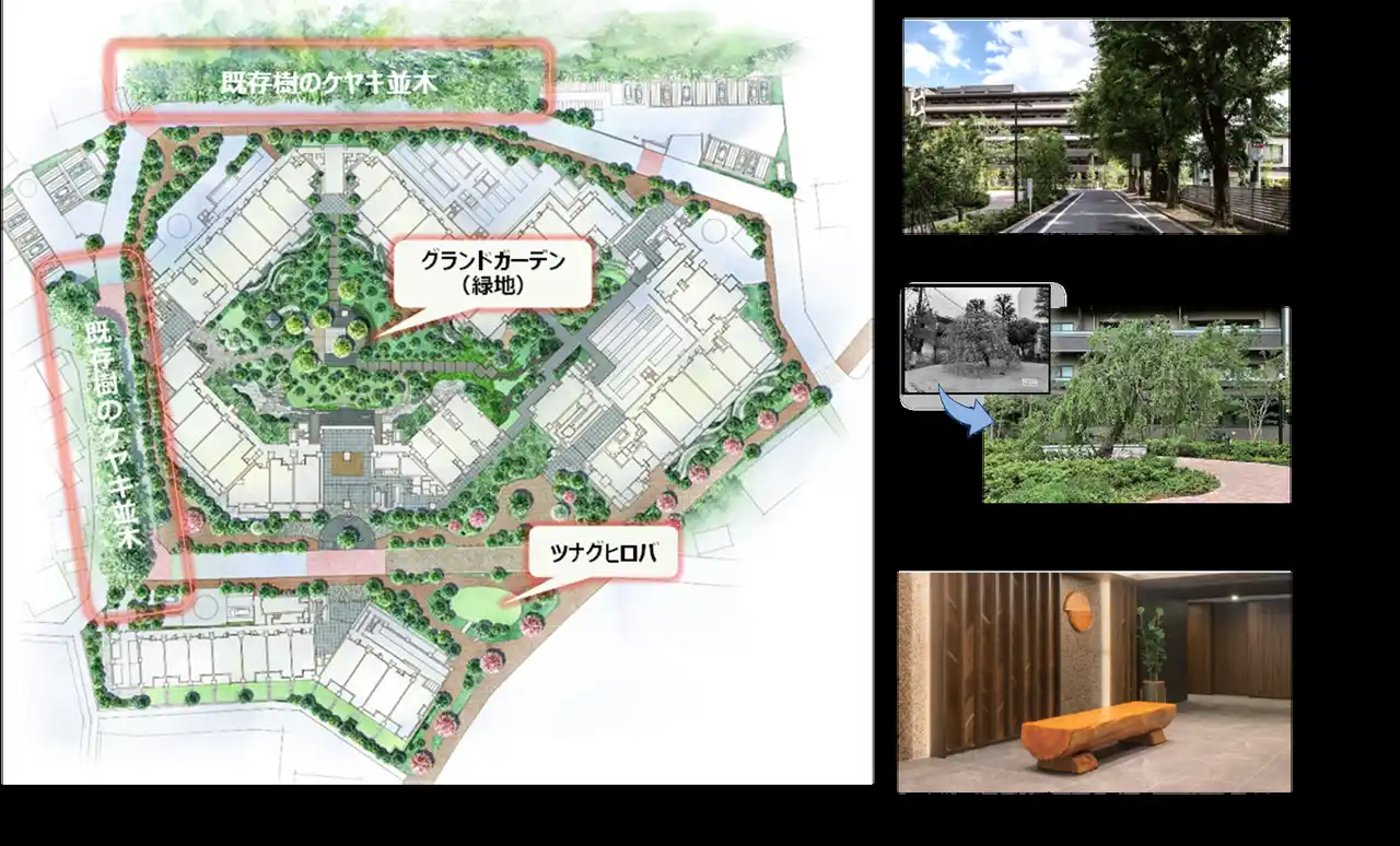 本物件は敷地面積約18,000平方メートル 、全500戸の大規模分譲マンションです。従前の建物は全246戸の団地で、敷地内には約50年間大切に育てられた桜、欅、杉、ユリの木など多様な樹木が多く生育していました。それらの樹木を団地の歴史として保存、再利用することに加え、従前団地に見劣りしない緑地緑量を備え、潤いある街づくり・都市の森づくりに取り組みました。 |