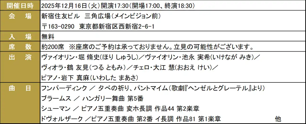 本公演は、音楽による感動を多くの人々と共有するべく全国で活動を続けられる同財団の活動に賛同し、当社グループが管理運営する施設において2024年4月から定期開催している「住友不動産グループ Presents 100万人のクラシックライブ」を、クリスマスシーズンにあわせたプログラムでお届けする特別公演です。プロの演奏家5名を迎え、冬の夜を彩る本格的なクラシックの楽曲をお楽しみいただけます。予約不要、入場無料でどなたでもお立ち寄りいただけますので、お気軽にお越しください。 |