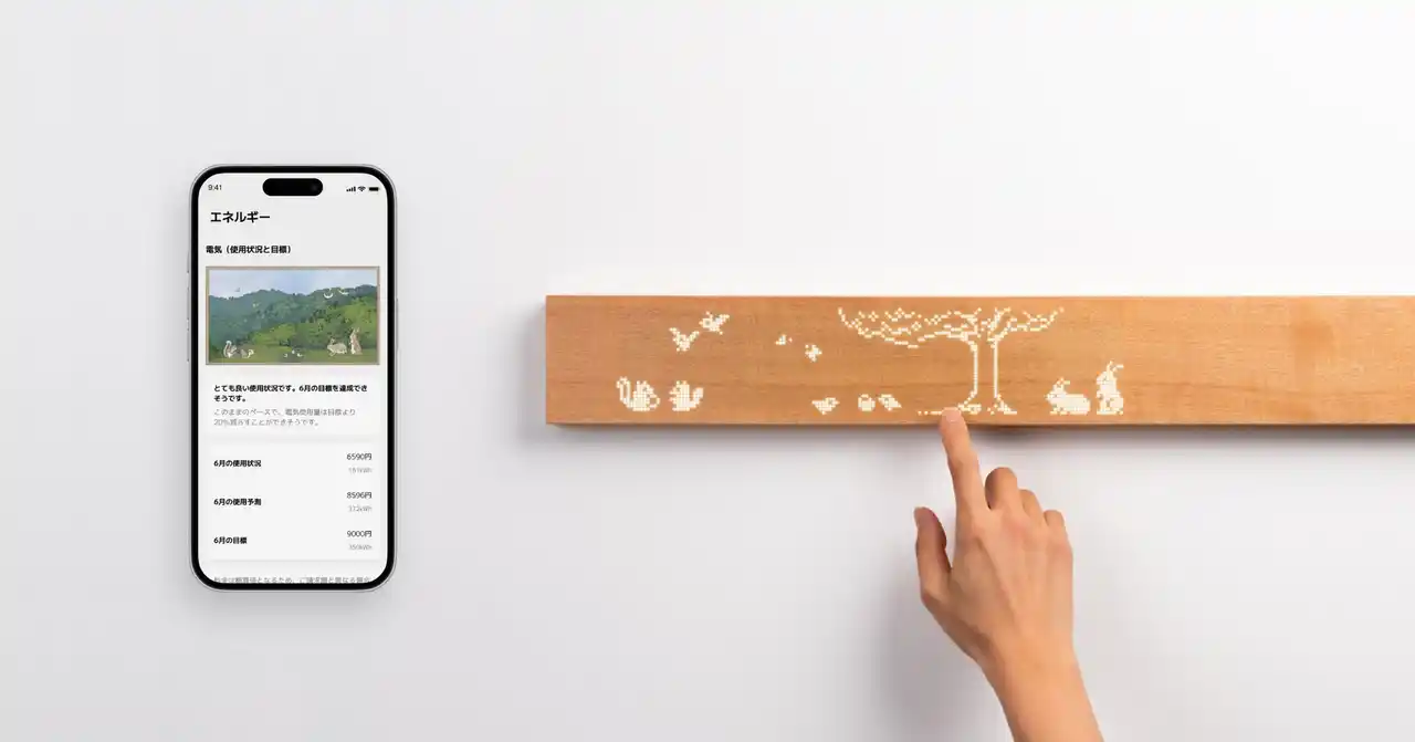 家庭内のエネルギー利用状況を「窓の外の景色」に見立てて表示する「HOMETACT Energy Window」機能。従来は「HOMETACT」アプリからのみの閲覧でしたが、本連携により、「muiボード」上にもあたたかみのある絵として表示されるように。家族全員が、自然にエネルギーについて考え、省エネを意識するきっかけとなります。 |