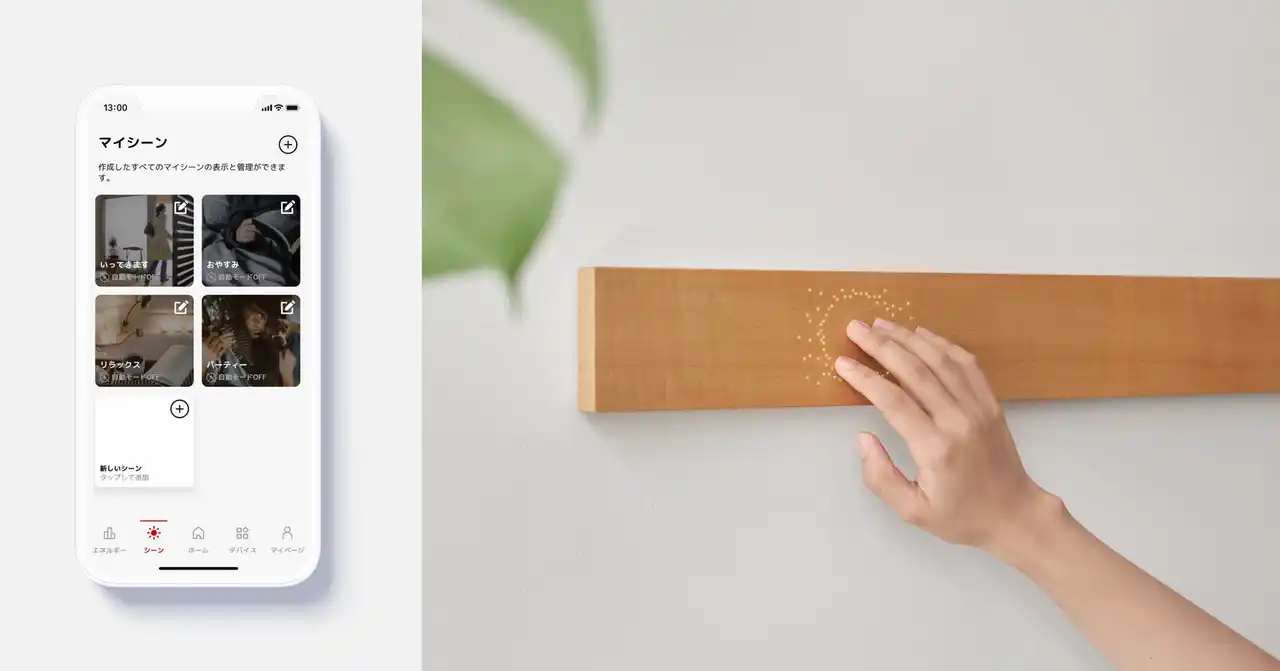 グッドデザイン賞受賞のHEMSコントローラー「muiボード」により、「HOMETACT」の操作性を拡張。アプリや音声操作に加えて、天然木のインターフェースからも操作可能に。くらしに調和するデザイン性や、家族とのコミュニケーションを豊かにする体験価値を付加。 |