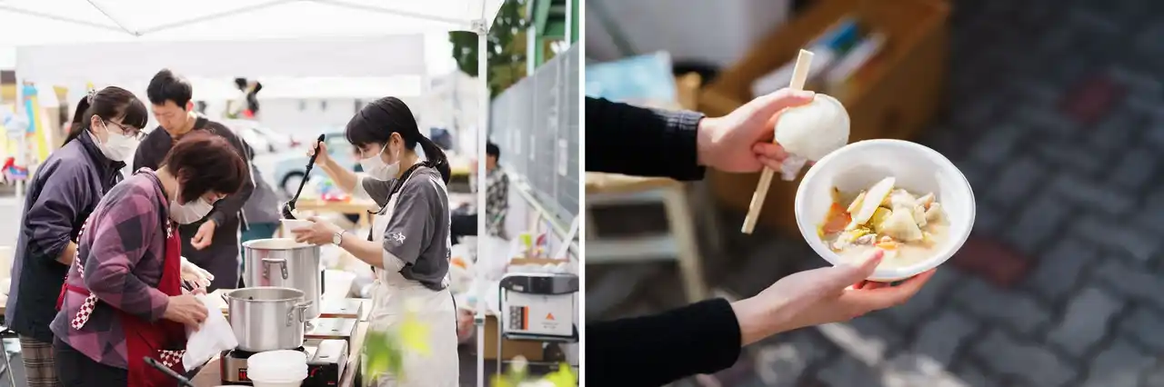 お昼には、食欲の秋にぴったりな芋煮やおにぎりが振舞われました。胃袋も喜ぶ企画に、訪れた人は笑顔を見せていました。 |