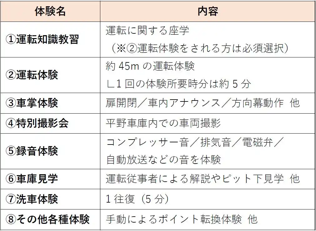 | (9)体験概要 平野車庫でのご希望の体験コンテンツ90分間 | |||