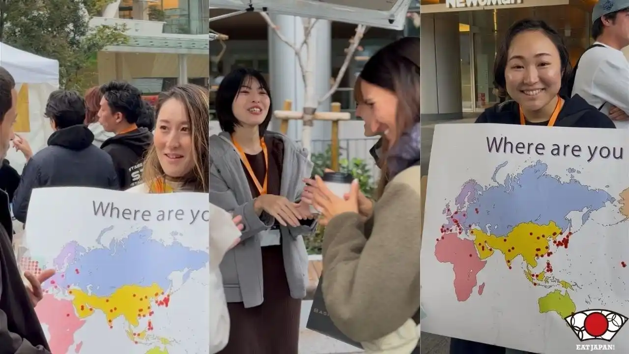 2日間は常に2~3ヶ国語対応ができるように配置し、来日者に「Where are you from?」の看板と共に出身国をマークできるような企画も実施。 |