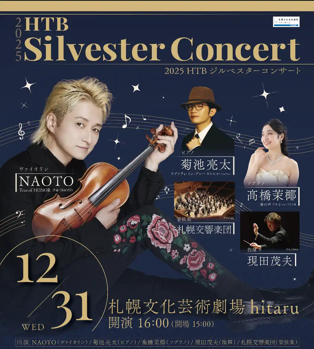 HTBが贈る年末恒例の”北海道のジルベスターコンサート”。第28回目となる2今回は、クラシックからポップスまでジャンルにとらわれない音楽センス、華麗なパフォーマンスで人気を博すヴァイオリニストNAOTO、YouTubeチャンネル登録者数80万人超のピアニスト菊池亮太、そして札幌出身の「花綱のように美しい声を持つ逸材」と評されるソプラノ歌手高橋茉椰が、一夜限りのスペシャルなステージをお届けします。 |