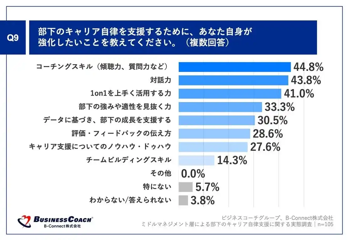「Q9.部下のキャリア自律を支援するために、あなた自身が強化したいことを教えてください。(複数回答)」(n=105)と質問したところ、「コーチングスキル(傾聴力、質問力など)」が44.8%、「対話力」が43.8%、「1on1を上手く活用する力」が41.0%という回答となりました。 |