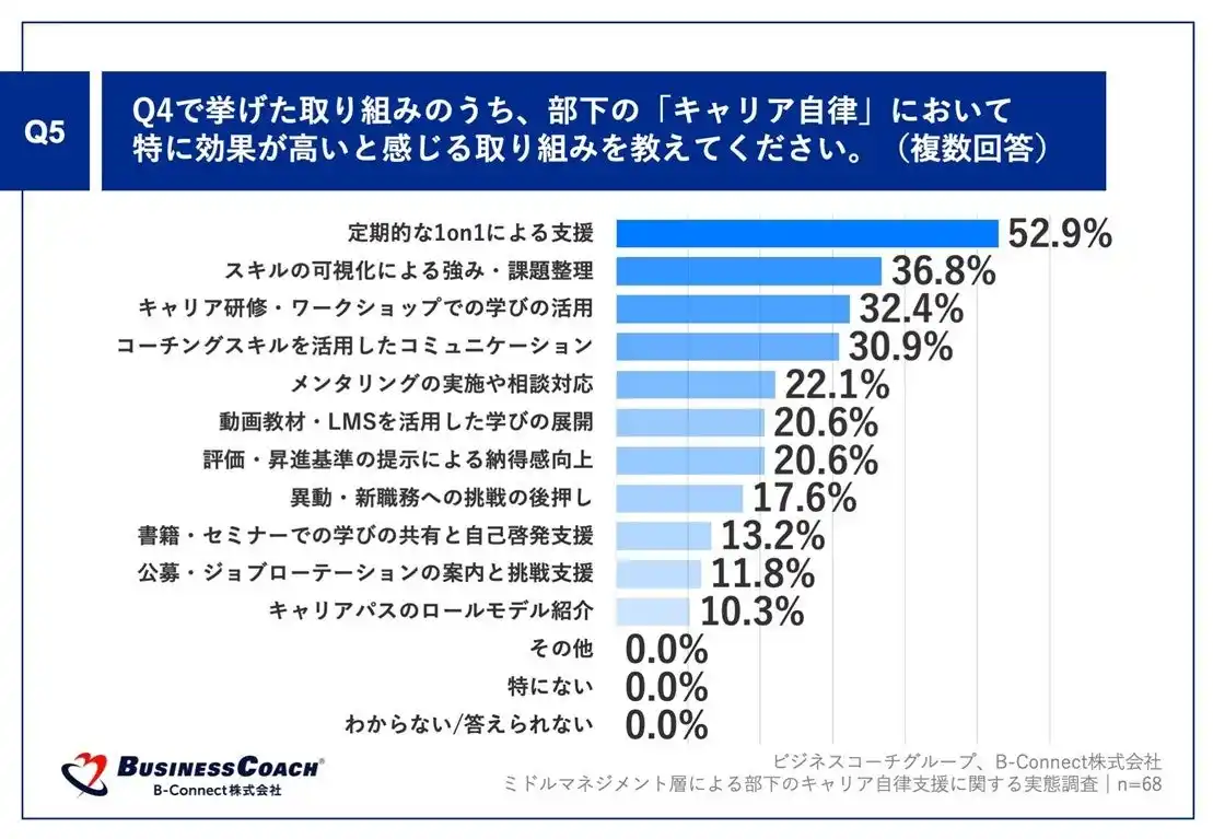 Q4で「特にない」「わからない/答えられない」以外を回答した方に、「Q5.Q4で挙げた取り組みのうち、部下の「キャリア自律」において特に効果が高いと感じる取り組みを教えてください。(複数回答)」(n=68)と質問したところ、「定期的な1on1による支援」が52.9%、「スキルの可視化による強み・課題整理」が36.8%、「キャリア研修・ワークショップでの学びの活用」が32.4%という回答となりました。 |