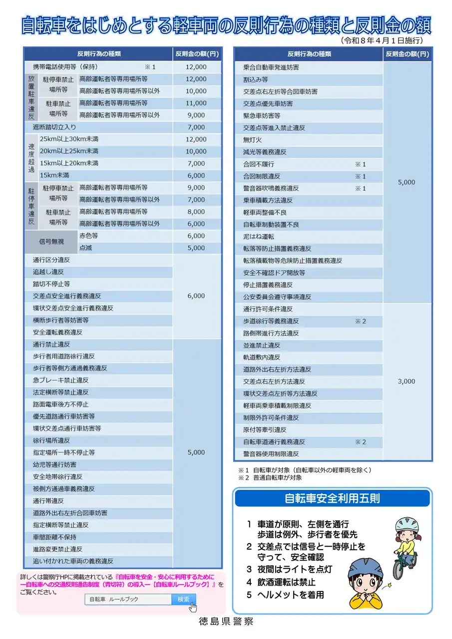 | 令和8年4月1日に自転車の交通反則金制度が施行されるに当たり、令和7年度年末年始交通安全県民運動中にJR徳島駅前周辺歩道上において、自転車利用者に対して広く自転車の交通反則金制度等を周知するとともに、自転車事故に備えた自転車保険の加入や点検整備の他、歩道への駐輪禁止を呼びかける交通安全キャンペーンを行います。 | |||||||||||||||