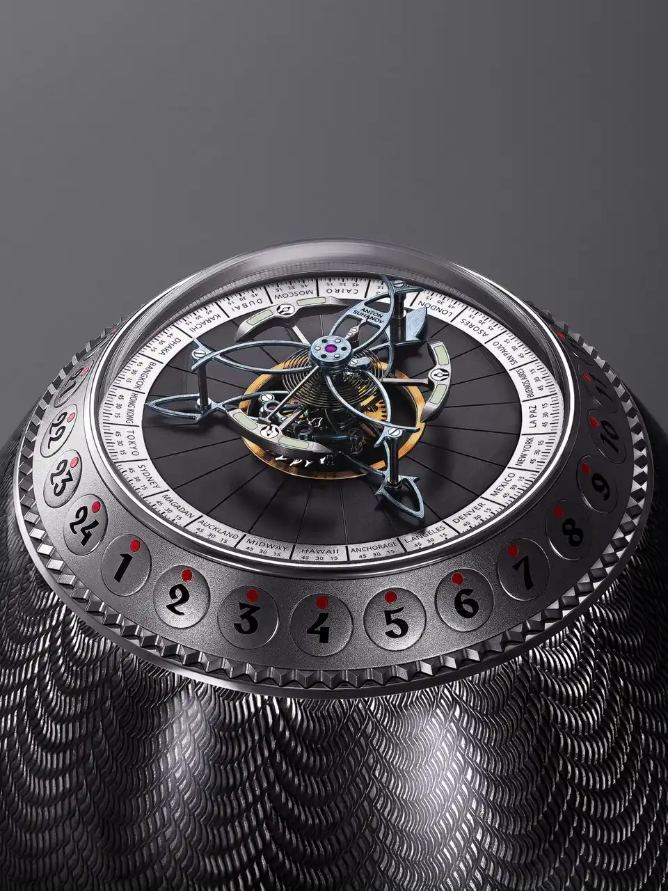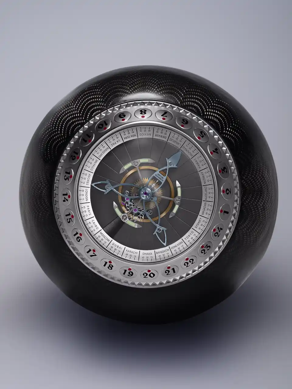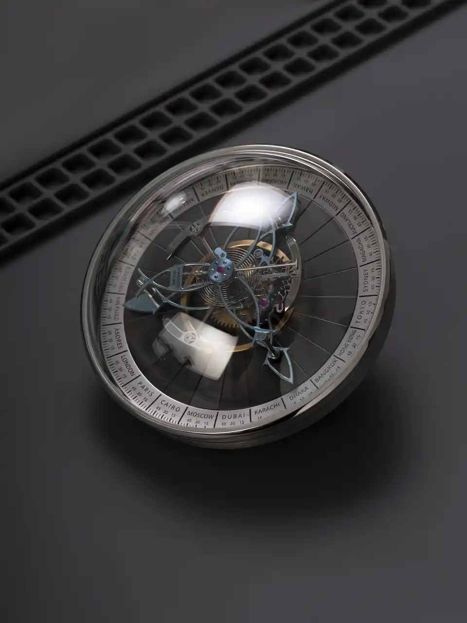 ミニマルな造形の中に、 ・ワールドタイム機能 ・24秒フライング・トゥールビヨン ・伝統的なギョーシェ彫りとエナメル装飾 ・2つの「サプライズ」ギミック |