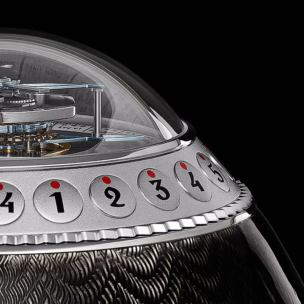 卵の滑らかな輪郭からわずかに浮かび上がるのが、24時間表示のスケールを刻んだ回転ベゼルです。 このベゼルは、世界24のタイムゾーンすべての時刻設定を担うと同時に、1回転24秒で回転するフライング・トゥールビヨンの「秒」表示としても機能します。 |