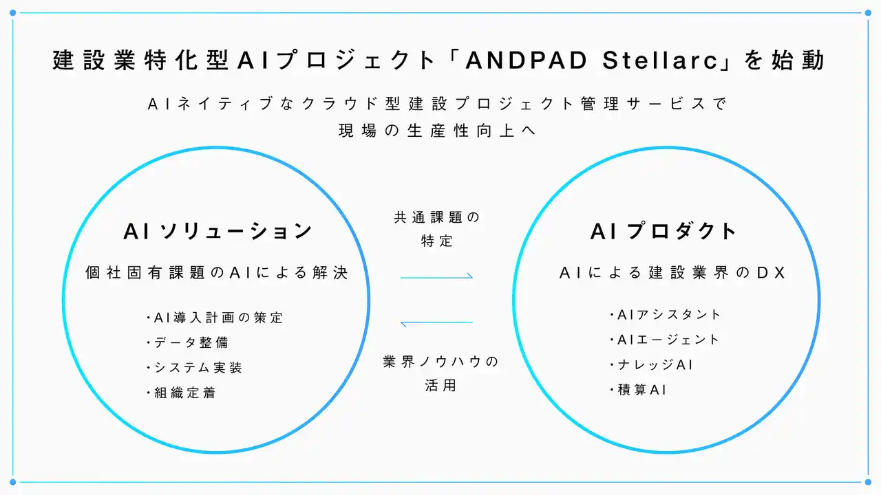 ANDPAD Stellarcは、AIソリューション事業とAIプロダクト提供を両輪とし、建設業界の深刻な担い手不足や技術伝承の課題解決を目指します。 |