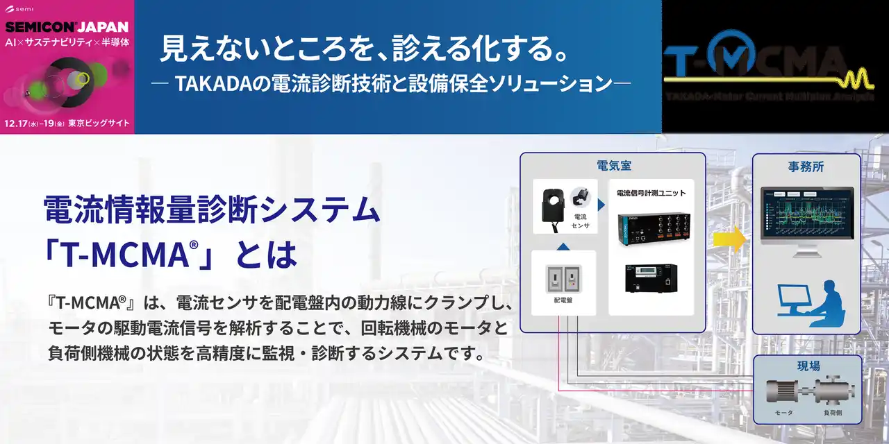 あわせて、弊社が開発した電流情報量診断システム【T-MCMA(R)】 による設備管理のソリューションをご紹介いたします。 当システムについて、詳しくは設備診断事業 | 事業紹介 |をご覧ください。 |