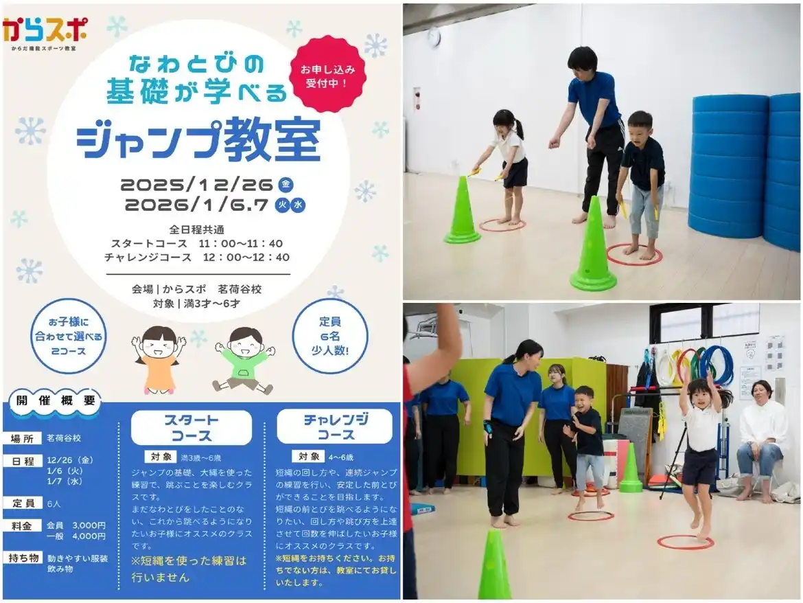 | なわとびが苦手・跳べない子向けの冬休み限定「ジャンプ教室」。専門教室からスポが短縄を使わず“跳ぶ感覚”から丁寧にサポートし、少人数制で「できた!」を育みます。 |
