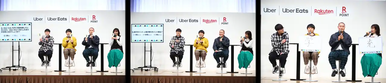 続いて行われたクイズでは、よりお得に使えるサービスをテーマにした3択のクイズに挑戦しました。「Uber」と「Uber Eats」を利用すればするほどお得になるメンバーシップ「Uber One」に関連して山口さん、ハナコさんが5回以上と予想する中、「Uber Eats を月に2回以上利用している人なら、Uber One に加入したほうがお得になる」という答えに対して、秋山さんが「すごいお得じゃないですか!みんな入ったほうがいい!」とそのお得さに、感心した様子でした。 |
