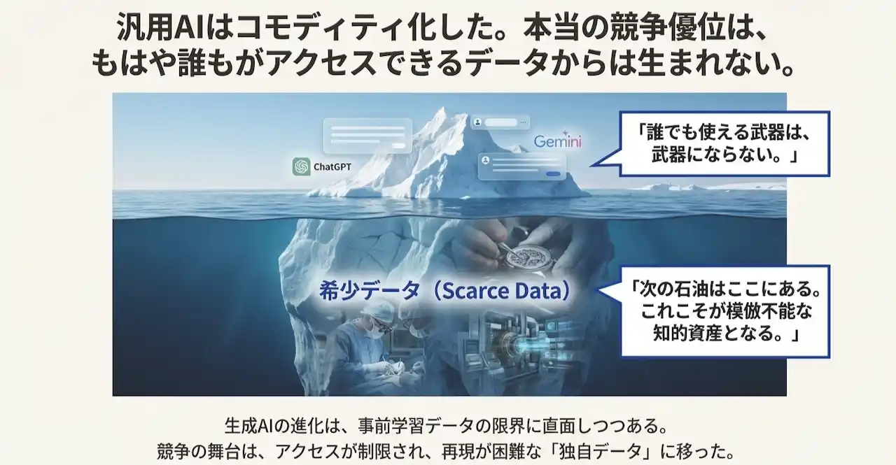 「生成AIツールの民主化により、誰もが高度なアウトプットを得られる時代になりました。しかし、それは同時に『誰もが同じ答えしか得られない』時代でもあります。真の差別化は、AIに何を学ばせるか、すなわち独自の教師データにかかっています。 |