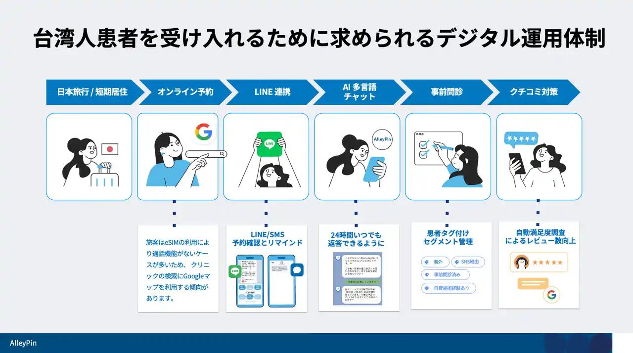 医療テック(MedTech)分野のサービスを提供する AlleyPin(アリピン株式会社) は、台湾市場において多数の医療機関への導入実績を持ち、台湾人患者のデジタル行動特性に精通した企業として知られている。 |