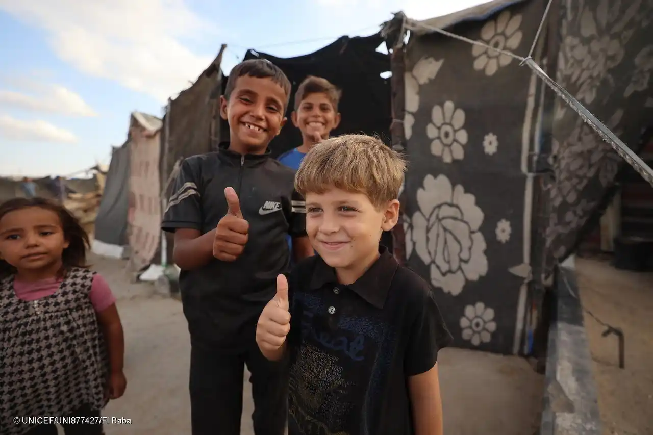 停戦の発表を喜ぶガザの子どもたち(パレスチナ、2025年10月9日撮影) (C) UNICEF/UNI877427/El Baba |