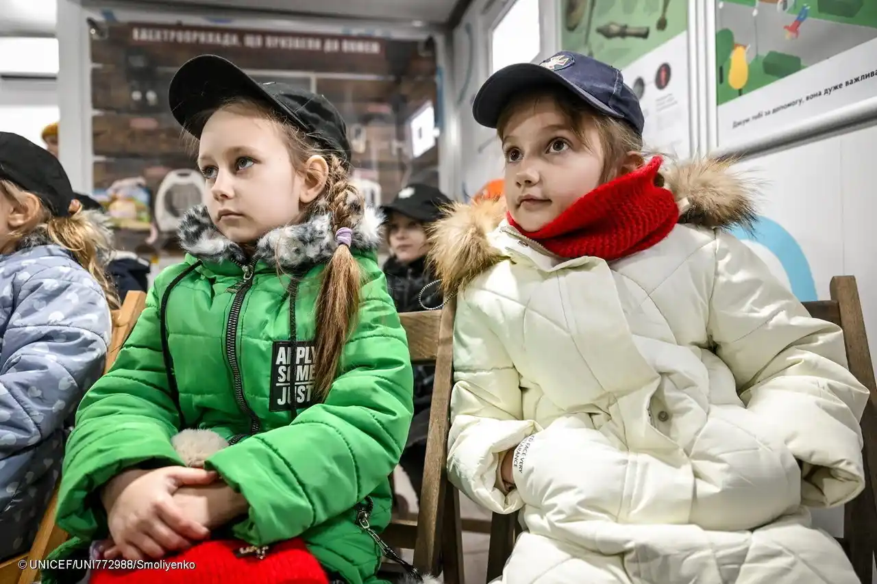 ザポリージャにあるユニセフが支援する移動式教室で、戦争下において安全を確保する方法を学ぶ小学1年生の子どもたち(ウクライナ、2025年2月25日撮影) (C) UNICEF/UNI772988/Smoliyenko |