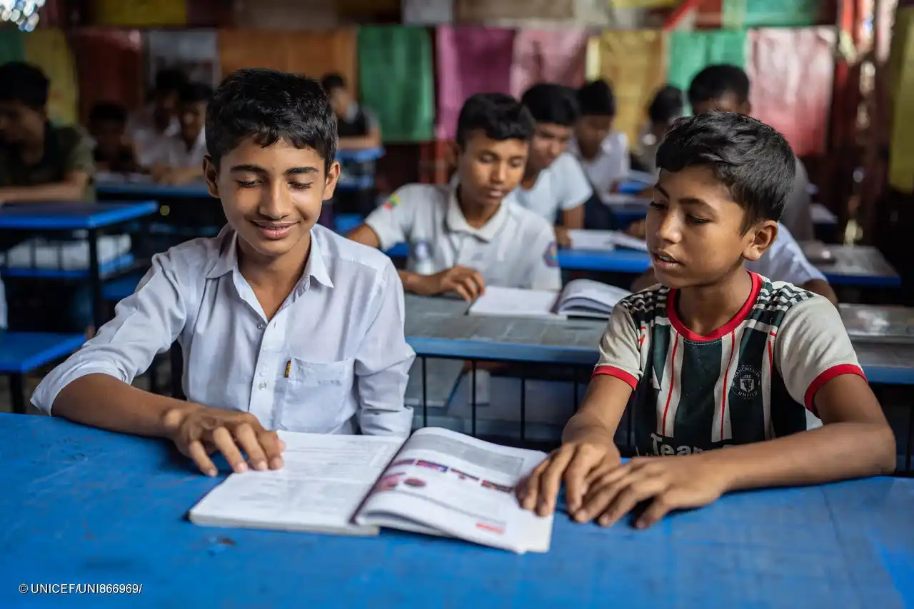 コックスバザールのロヒンギャ難民キャンプにある学習センター。教育支援は、児童婚や武装集団による徴用の危険から子どもたちを守る手段の一つ(バングラデシュ、2025年8月20日撮影) (C) UNICEF/UNI866969/ |
